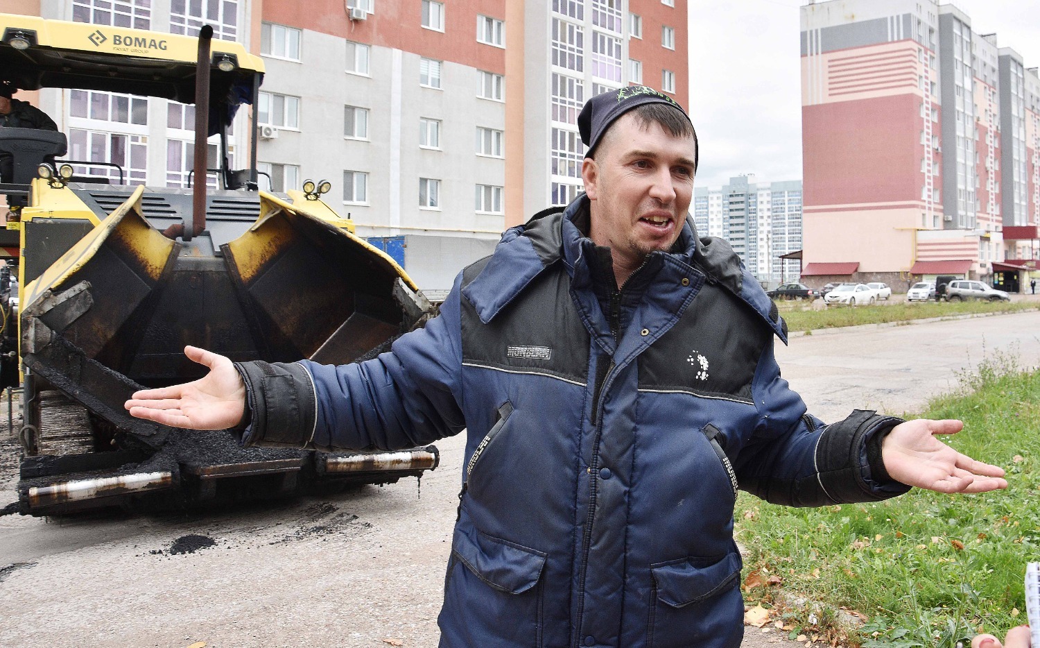 В подтверждение своих слов демонстрирует работу дорожников и заочно знакомит с каждым специалистом: