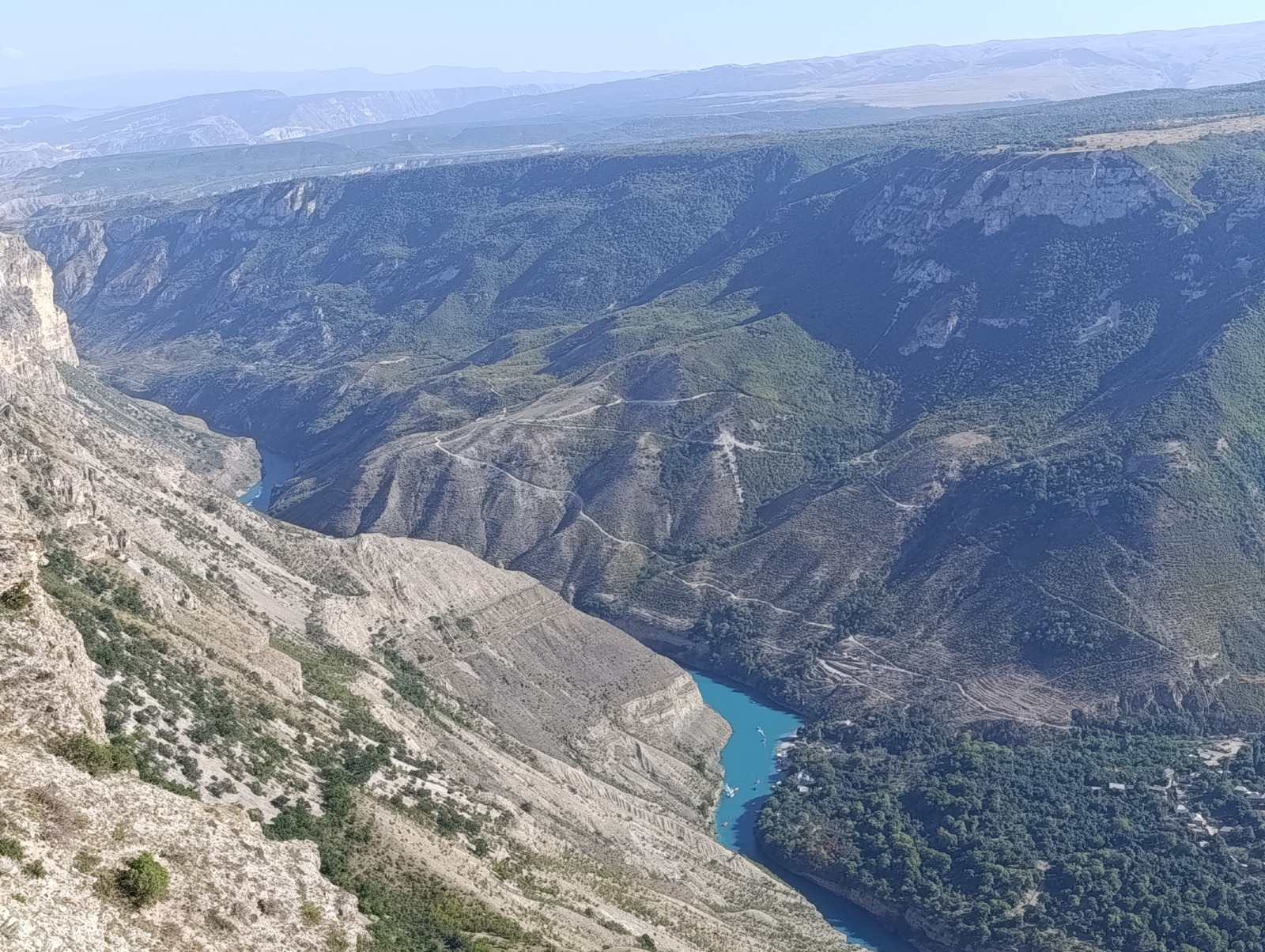Однако когда мы въехали на территорию Дагестана, пейзаж за окном сразу стал веселей: трава зеленей, деревья выше. Серьёзно. Коровы с горизонта, конечно, не пропали, но хотя бы исчезла песчаная буря. По мосту пересекли Терек - горный красавец Кавказа.