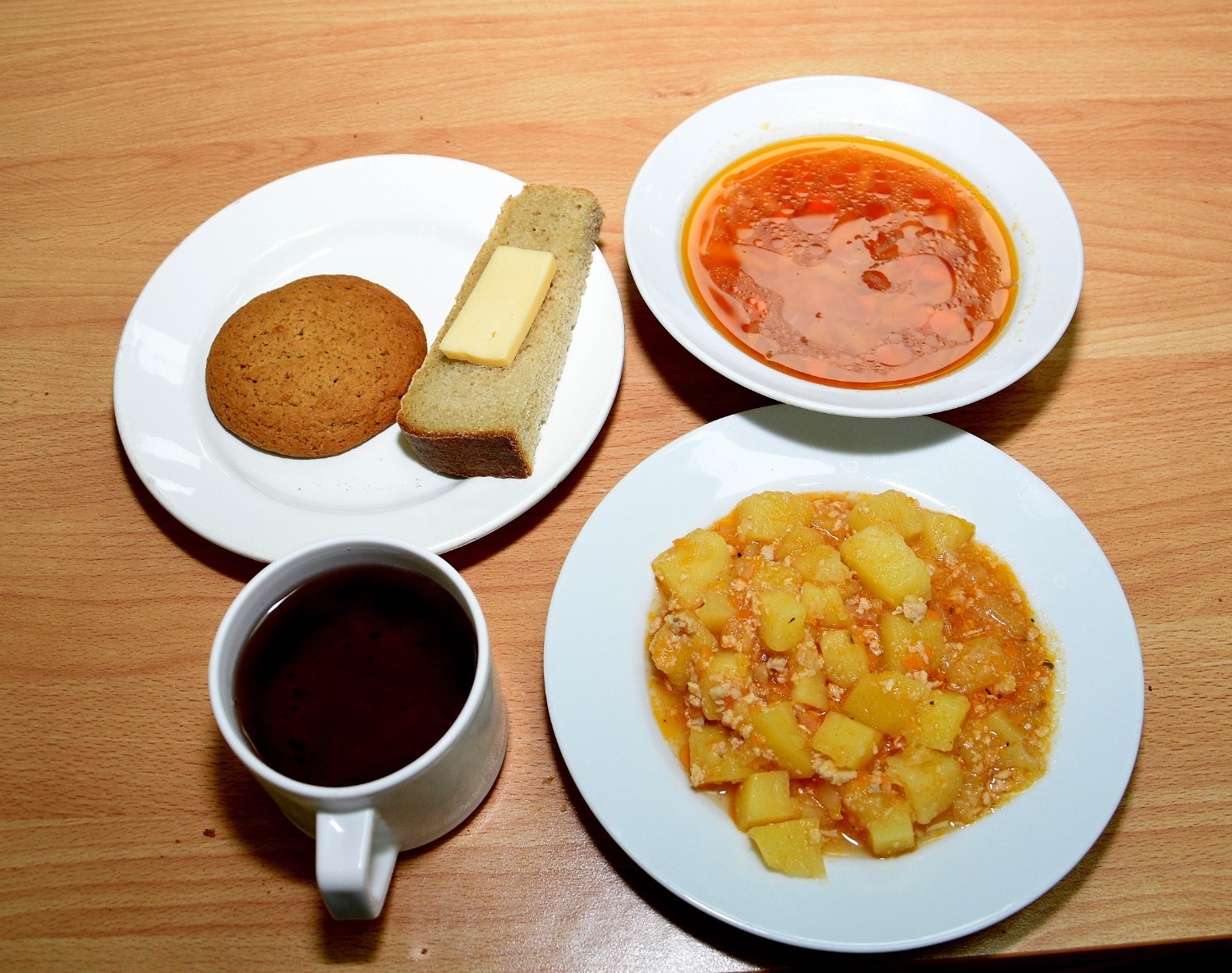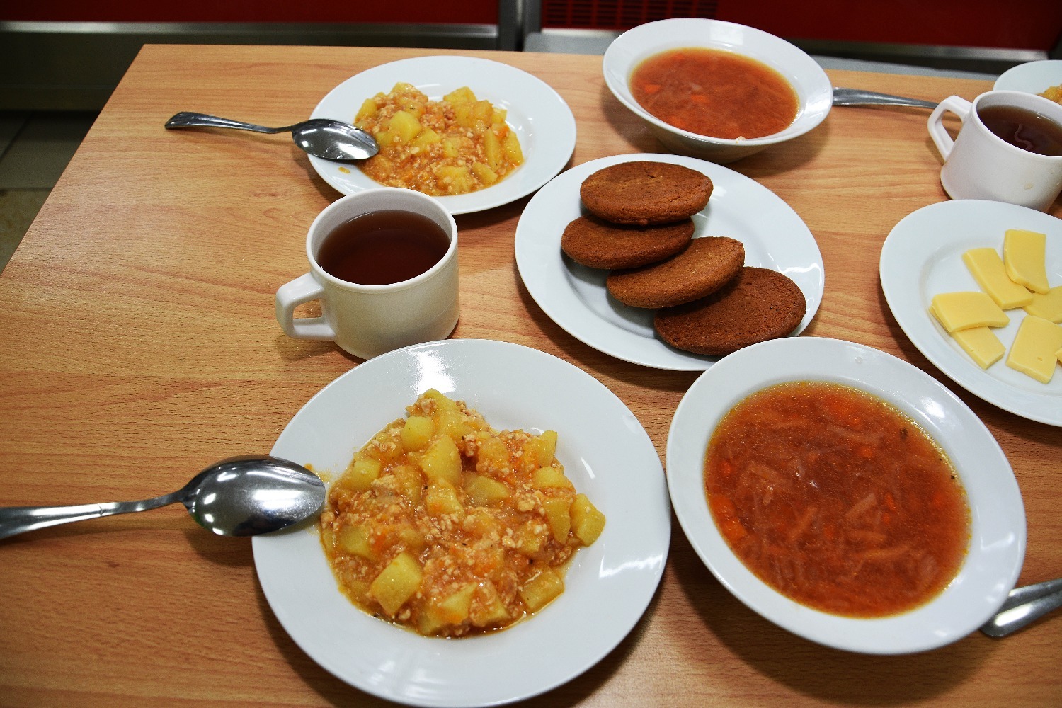 В меню у школьников - любимый для многих борщ и картофель тушёный с мясом, чай и овсяное печенье. Дети, к которым я обращалась с вопросами, отвечали, что любят школьную еду, что она всегда тёплая и вкусная, блюда разнообразные.