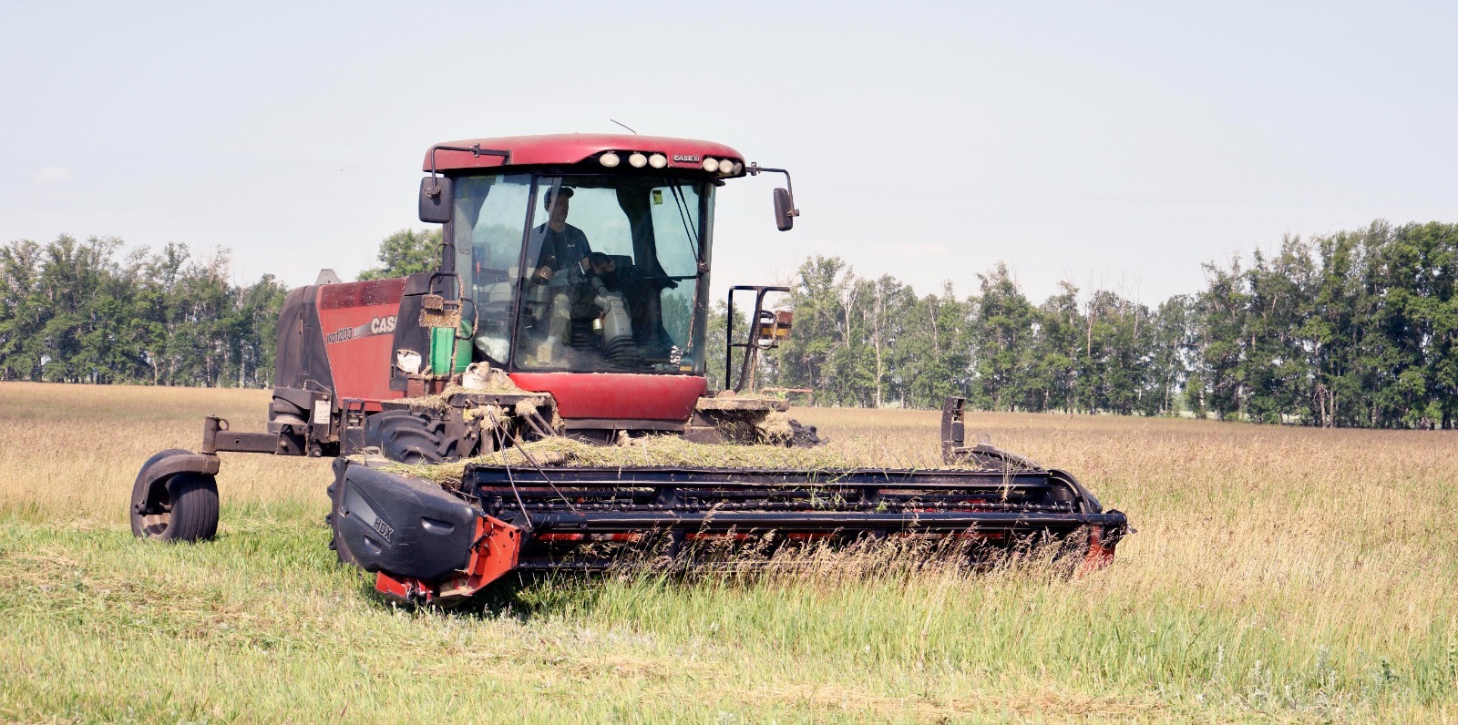 Мы побывали в хозяйстве 25 июня и сами смогли убедиться, как организованы летние будни одного из успешных сельхозпредприятий района. Сначала заехали к месту заготовки кормов – на поле костреца в 300 гектаров трудилась самоходная косилка «Кейс», укладывая поспевшую траву в аккуратные валки.