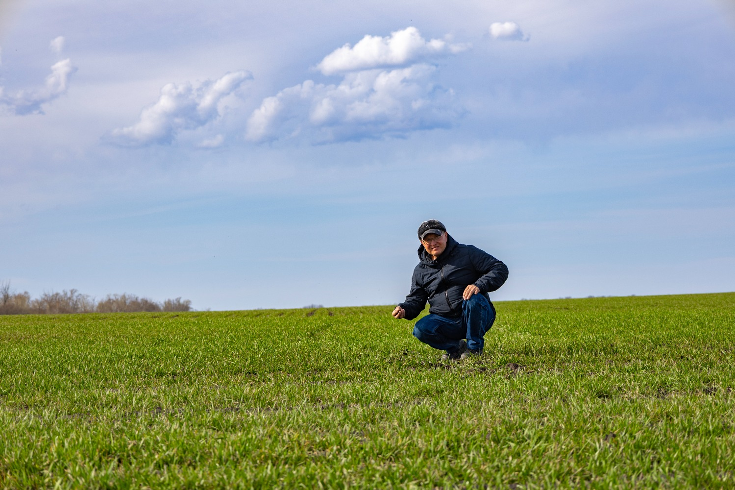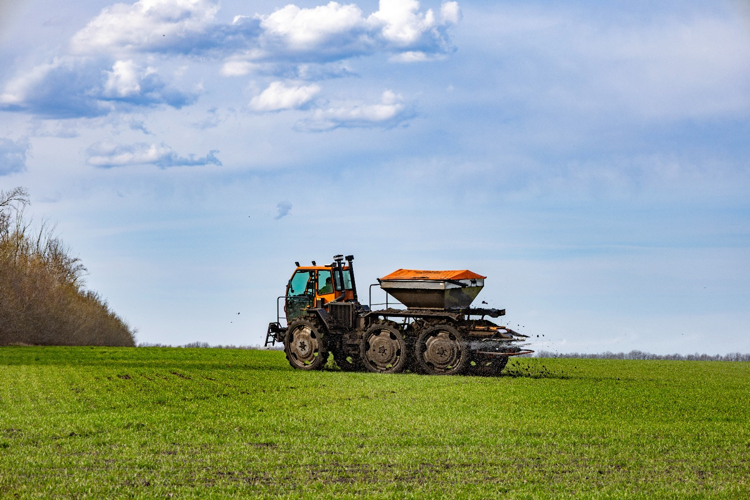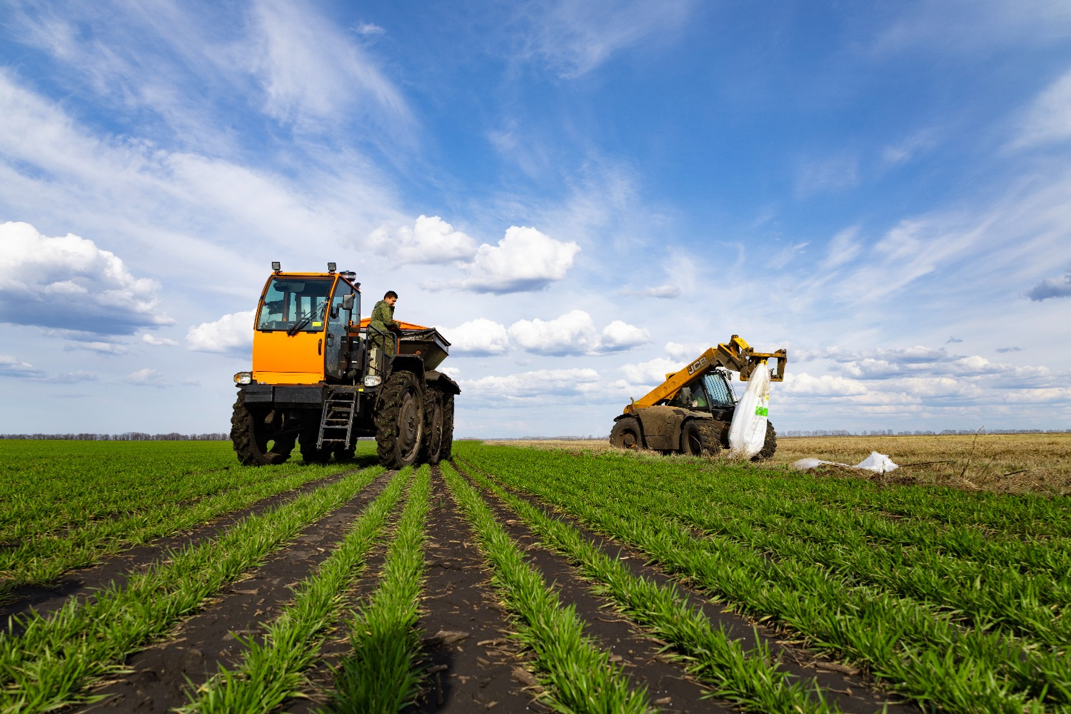 В момент нашего приезда новенький трудяга-разбрасыватель «Туман-2М» шустро колесил по ярко-зелёному полю озимой пшеницы (эту технику на пневматическом ходу приобрели буквально к началу нынешнего полевого сезона). Механизатор Рамазан Галиев умело управлял самоходной машиной. По выражению его лица было видно, что настроение у парня приподнятое, как, впрочем, у остальных участников полевых работ – у опытного и знающего Олега Стенникова, который при помощи погрузчика JCB раз за разом подавал огромные биг-беги с удобрением к бункеру разбрасывателя, а также у водителя Николая Баранова, без перебоев и срывов подвозящего к кромке поля на высокопроходимом КамАЗе 900-килограммовые мешки с азотной подкормкой для озимых.