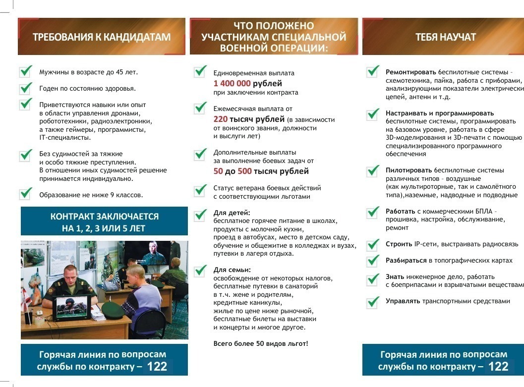 Служба в войсках БПЛА предоставляет повышенный уровень безопасности и гибкие сроки контракта, а военнослужащие сохраняют специальность и получают полный социальный пакет. Студенты могут заключить контракт с возможностью академического отпуска, а за успешные действия предусмотрены денежные вознаграждения.
